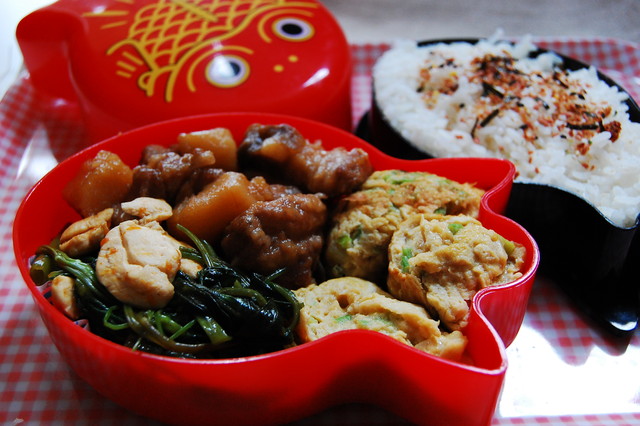 雖然暑假來臨不用帶便當,但是中午還是要煮飯吃,於是做便當上癮的笨媽媽還是幫寶鼻把飯裝在便當裡,