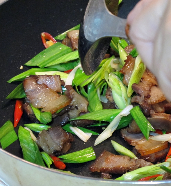 媽肯迫不及待用手捏一口蒜苗配臘肉偷吃,