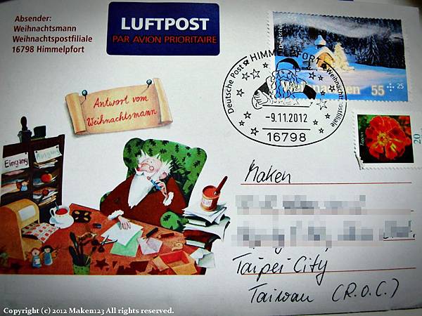 謝謝我的好朋友哈矇,寫信拜託德國的聖誕老公公寄耶誕卡給我!!超感動的