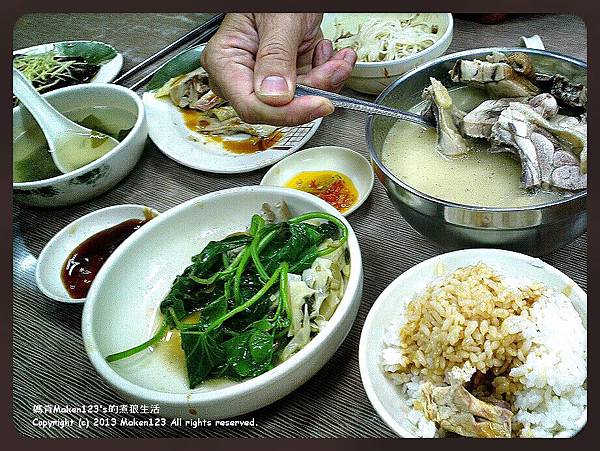 照片中的麻油麵線配上白斬雞肉,地瓜葉還有雞油飯,